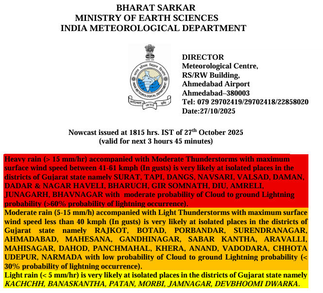 Rain Forecast Gujarat : ગુજરાતના મોટાભાગના વિસ્તારોમાં કમોસમી વરસાદ વરસી રહ્યો છે. માવઠું થતાં ખેડૂતોના પાક પર પાણી ફરી વળ્યા છે. તેવામાં હવામાન વિભાગે આગામી 31 ઓક્ટોબર સુધી સૌરાષ્ટ્ર અને દક્ષિણ ગુજરાત સહિતના વિસ્તારોમાં ભારેથી અતિભારે વરસાદને લઈને ઍલર્ટ જાહેર કર્યુ છે. જેમાં સોમવારે (27 ઓક્ટોબર) રાત્રે 10 વાગ્યા સુધી રાજ્યના 10 જિલ્લામાં હવામાન વિભાગે રેડ ઍલર્ટ જાહેર કર્યુ છે.