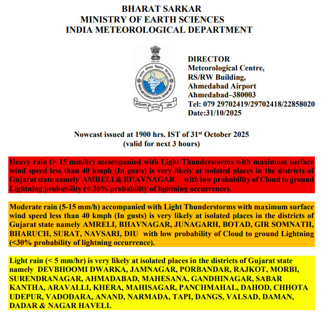 Rain Forecast : સૌરાષ્ટ્ર અને દક્ષિણ ગુજરાત સહિતના જિલ્લામાં ભારેથી અતિભારે કમોસમી વરસાદ વરસી રહ્યો છે. છેલ્લા ત્રણ-ચાર દિવસથી માવઠું થતાં ખેડૂતોના પાક પર પાણી ફરી વળતાં ભારે નુકસાન થયું છે. તેવામાં હવામાન વિભાગે રાજ્યમાં હજુ 6 દિવસ હળવાથી ભારે વરસાદની આગાહી કરી છે. હવામાનના ત્રણ કલાકના નાવકાસ્ટ મુજબ આજે 31 ઑક્ટોબરે રાત્રે 10 વાગ્યા સુધીમાં અમરેલી અને ભાવનગર જિલ્લામાં રેડ ઍલર્ટ જાહેર કર્યું છે.